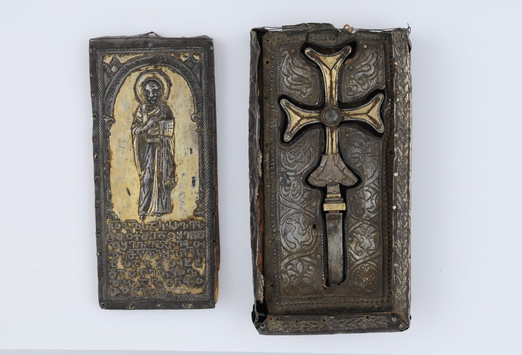 “The virtuous log”, that is a cross shaped wooden tabernacle which is decorated with silver paper. The forged icon of St. Grigil is on the door of the tabernacle. The inscription is located at the feet of the saint. According to Giorgi Bochoridze the name Sahakdukht could be referring to Sagdukht the Queen, mother of Vakhtang Gorgasali. Paleographic data proves that the inscription can be similar to the ancient Georgian inscriptions: the top arch of Ⴁ and Ⴗ are engaged, while Ⴘ are Ⴣ open. Ⴍ looks similar to Greek. The form of „დაჲცევ“ is notable. Here the letter Ⴢ represents [ჲ] the alophon in V-C position. This is the earliest representation of this type of case. G. Bochoridze gave this inscription the date of VI century in 1927, but in 1929 changed this date to V century. Akaki Shanidze and Pavle Ingorokva also state that the inscription is of the V century.