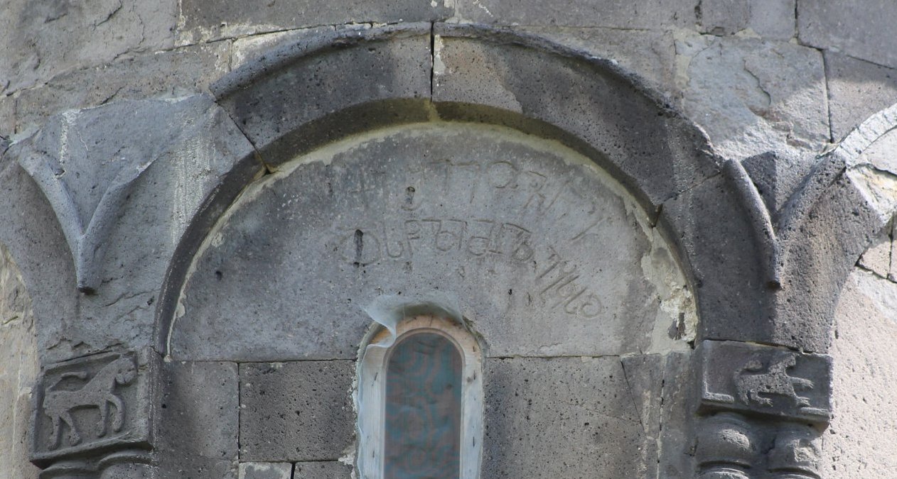 According to the Corpus of Georgian Inscriptions by Nodar Shoshiashvili the inscription #94. The inscription does not contain any mark of separation. No spaces between the words. Dating the inscription according to the paleographic data, the shape of the graphemes: grapheme Ⴊ sometimes has quite a big circle and a short neck joins the circle in the middle. the upper left edge of the grapheme Ⴢ is leaned and departs from the lower edge greatly; Letter Ⴌ is represented with Mkhedruli alphabet; tendency of lengthen the letters; adjusting to fit the four line format. Words follow each other without leaving out the space. Ornaments and carvings of the church.