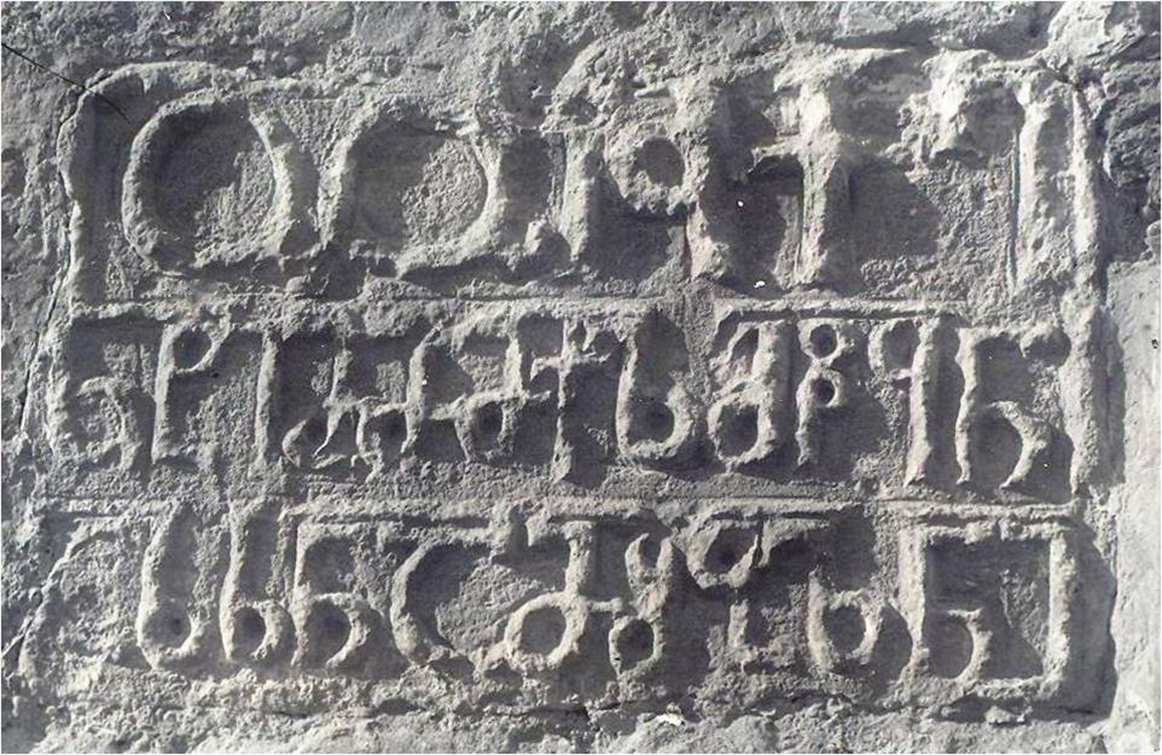 According to the Corpus of Georgian Inscriptions by Nodar Shoshiashvili the inscription #1. The inscription does not contain any mark of separation or abbreviation. No spaces between the words. According to Nodar Shoshiashvili the dating of the inscription is based on the paleographic data: Ⴁ, Ⴣ, Ⴑ, Ⴗ, Ⴘ, Ⴜ graphemes have full circled rings, Ⴁ and Ⴜ have the top arches engaged for both upper and lower arch. The grapheme Ⴑ is also fully engaged. P. Zakaraia dates the inscription to the turn of the VI century. V. Silogava considers that the inscription is from the X century.