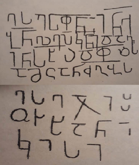 According to the Corpus of Georgian Inscriptions by Nodar Shoshiashvili the inscription #64-65. Abbreviation mark: long horizontal straight line. The inscription does not contain any mark of separation. The inscription is dated according to the paleographic data: the tendency of the graphemes Ⴊ and Ⴌ towards adopting a Nuskhuri style. Also: Ⴁ is open and Ⴣ is engaged. The inscription does not seem to be contemporary to the “Bolnisi Cross”. In the inscription on side 2 the letters Ⴣ and Ⴘ are averted by mistake and engraved.