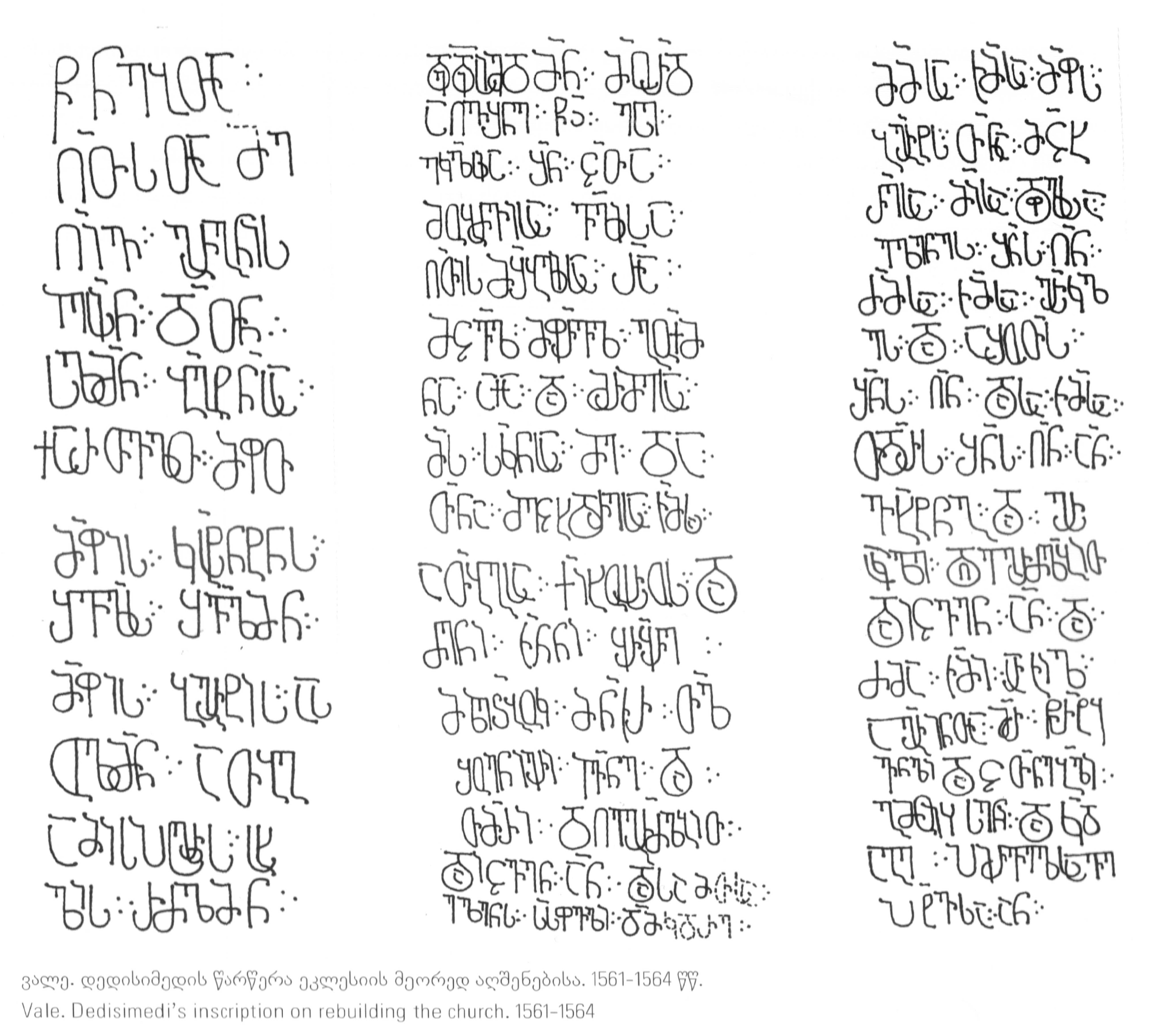 ღვთის ნებით, მე, ღვთივგვირგვინოსნის, იესეიან-დავითიან-სოლომონიან-ბაგრატოვანის, ქართველთა მეფეთ-მეფის კონსტანტინეს შვილიშვილმა, მეფე ბაგრატის ასულმა, ათაბაგ-ამირსპასალარის სახლის რძალმა, დედისიმედმა, მეორედ ავაშენე ეს წმინდა ეკლესია შენთვის, ცის მბაძავი ვალის ღვთისმშობელისათვის, რათა დაგვიცვა და გვიმფარველო აქ და საუკუნო ცხოვრებაში მე და ჩემს თანამეცხედრე ათაბაგ ქაიხოსროს. ჩვენი შვილები: ყვარყვარე, მზეჭაბუკ, მანუჩარ, თუალშუენიერი, ივანე და თამარი დღეგრძელობით დაიცავი, ამინ. მათ დას, ელენეს, სასუფეველი დაუმკვიდრე. მამაჩემს, მეფე ბაგრატს, და მის თანამეცხედრეს, დედოფალ ელენეს, ღმერთმა შეუნდოს. ჩემს ძმებს: ჰერაკლეს და აშოთანს შეუნდოს ღმერთმა. ჩემს დას თეოდორას შეუნდოს ღმერთმა, ამენ. ვახტანგ და ჰერაკლე დღეგრძელობით დაიცავი, ამენ. ჩემი ძმა არჩილი, აგარიანების მიერ მოტაცებული და ცთუნებული, გამოიხსენი და პირველ პატივში დააბრუნე, ამინ.
