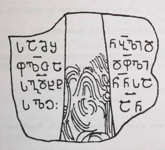 კირქვის ფილაზე გამოსახული ყოფილა რელიეფური ორნამენტირებული ჯვარი, რომლის ზედა და განივი მკლავები მომტვრეულია; დღეს სახეზეა ჯვრის ქვედა მკლავი. ფორმულა"ორთავე ცხორებასა შინა" პირობითია. რადგანაც ჩვენ არ ვიცით, რა სიდიდის ტექსტი აკლია წარწერას დასაწყისში, შეიძლება დავუშვათ, რომ ის არც იყო. აღდგენის ვარიანტი: ["ეკლესიი]სა", ["საყრდი]სა". როგორც აღინიშნა, წარწერა ამოკვეთილია ფილაზე, რომელზედაც რელიეფური ჯვარი იყო გამოსახული. ამიტომ შეიძლება დავუშვათ, რომ წარწერაში ჯვრის აღმართვის შესახებ იყო აღნიშნული და მისი ნაკლული ტექსტი შეიძლება ასეც აღვადგინოთ: [ღ(მერთ)ო, შ(ეიწყალ)ე ამ(ი)ს ჯ(უა)რი]სა მ(ა)შ(ე)ნ(ე)ბ(ე)ლი და ა.შ.